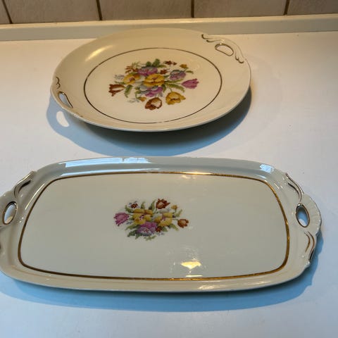 Samling på 4 porcelænsfade med håndmalede blomster - perfekt til servering af lagkager, kage osv. Passer godt til kolonihave stil, mormorstil, vintage stil osv. Fremstår med ubetydelige småfelj. Samlet pris.