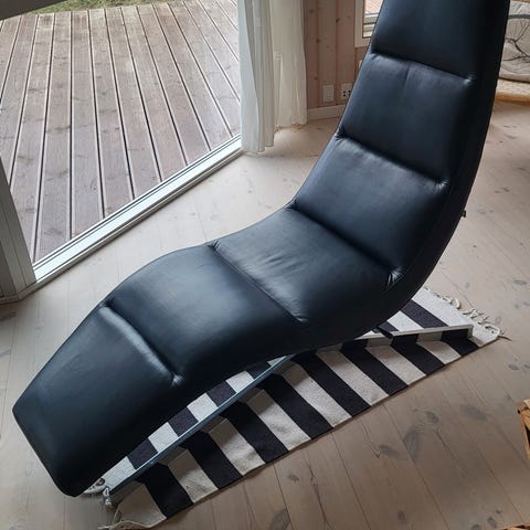 Briks, Chaiselong, læder PU - super dejlig at ligge på læse en god bog eller bare blunde hen, den er i en rigtig fin stand med få brugsspor dog mangler der en knap som ikke haves se billedet hvor der peges men det hindre ikke i at ligge godt - kan justeres fra sidde op til ligge helt ned