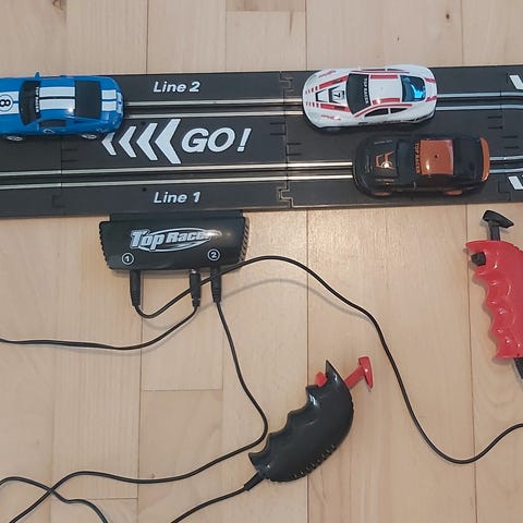 racerbane , ukendt, jeg har en kasse med skinner til en racerbane der 1 bil kom og kik har ikke forstand på racerbaner
