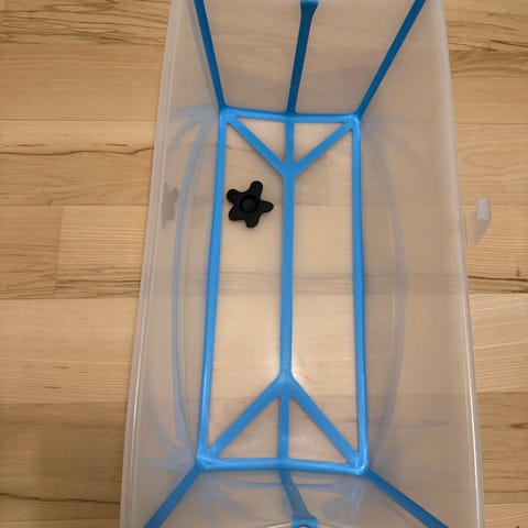 Badekar, Stokke badekar med indsats, Stokke, Stokke fold bart badekar i blå med baby indsat i god stand. Klemmen til at lukke sammen, er knækket sammen. L 63 cm. B 35 cm. H 23 cm.