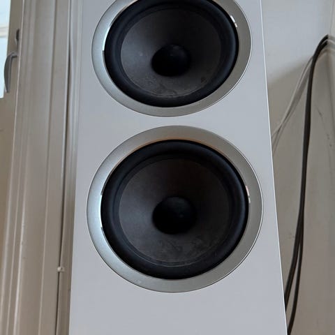 Den ene højttaler har et lille hak, der næsten ikke ses.