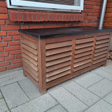 Hyndeboks, JUTLANDIA, Sort polyrattan, Hyndeboks JUTLANDIA i sort polyrattan med kørehåndtag i den ene side og hjul i den anden side og let anvendeligt hydraulisk låg frostsikker længde 130cm bredde 50cm højde 65cm nypris kr2700 sælges for absolut fast pris kan ikke forhandles kr1000