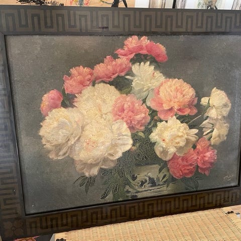 Oliemaleri, I G Skouboe, motiv: Blomster/Have, stil: Naturalistisk, b: 55 h: 58, Fint blomster billede typisk for Skouboe