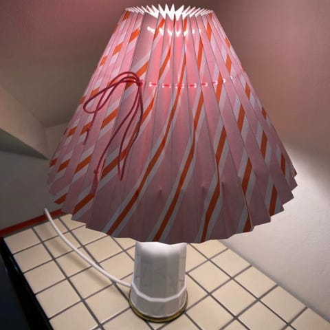 Brøste, cylindrisk lampeskærm med en lysegrå overflade. Lampeskærmen har en simpel og moderne. Materialet fremstår som tekstileret eller stofbelagt, hvilket giver en blød og neutral æstetik.