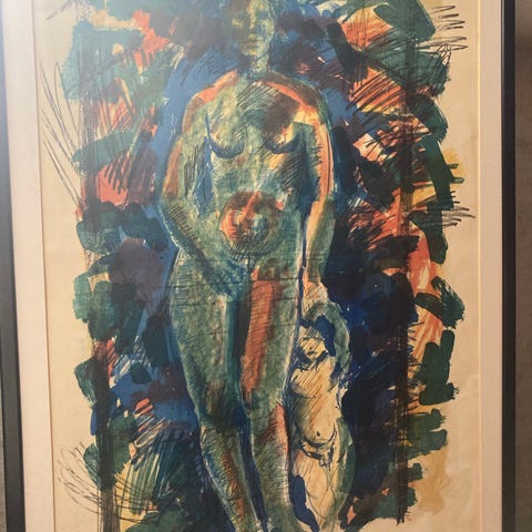 Offset tryk ud fra Foto, motiv: Halvnøgen kvinde på sofa, b: 70 h: 50, i grå metalramme med glas og passepartout, motiv 39,5 x 48,5 cm, anslået alder ca.1950erne, lige til at hænge op.