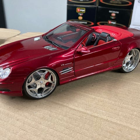 Modelbil, Mercedes SL55 AMG 1/18, skala 1:18, En rigtig flot og meget detaljeret modelbil i 1/18. Den mangler et spejl og så har den ridser rundt omkring især tag. Fed model med mange detaljer. Åben model. Produceret i god kvalitet af Maisto.
