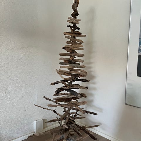 Filigrantræ, Håndlavet filigrantræ i hårdt træ med 6 tværpinde og 12 stk. træpynt med læderstrop.