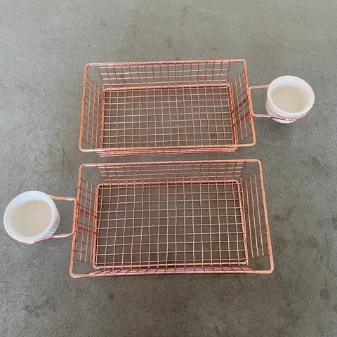 Mini friturekurv til servering, 4 stk., f.eks. pommes frites. Er aldrig blevet brugt. Ses her sammen med Holm smedejernstallerken. Rustfrit stål. Mål på selve kurven: L: 10 cm. B: 8 cm. H: 6,5 cm. Se str. i forhold til coladåse på foto 4. Rengøring med varmt sæbevand anbefales. Prisen er for alle 4 stk. samlet. Ann. nr. T566