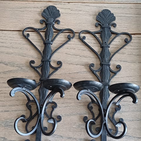 Og 3 enkelte stager til vægophæng, til 1 stearinlys, Hængt i 50 år i sommerhus, lidt rustne, men intakte. Har ikke sat i stand med maling e, lign, så helt originale.