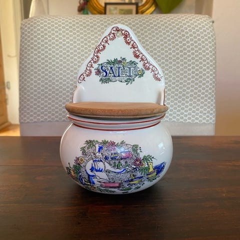 Hvid keramik med flerfarvet dekoration, typisk for tingene fra Aksini. Mrkt. på bund med "Aksini Stentøj Danmark" + logo (Aksini = Aksel Sigvald Nielsen).