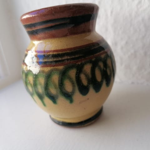 Fajance, Lille vase, fugl/blomster-motiv, flerfarvet, 12,5 cm høj.