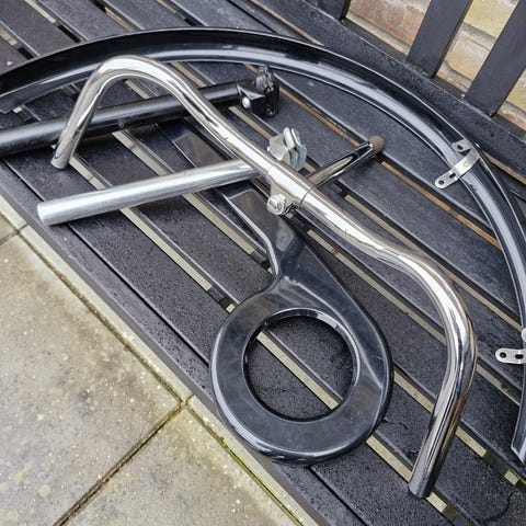 Cykellygte, ringeklokke, krog til cykel ophæng, lygter holder og bremseklodser.