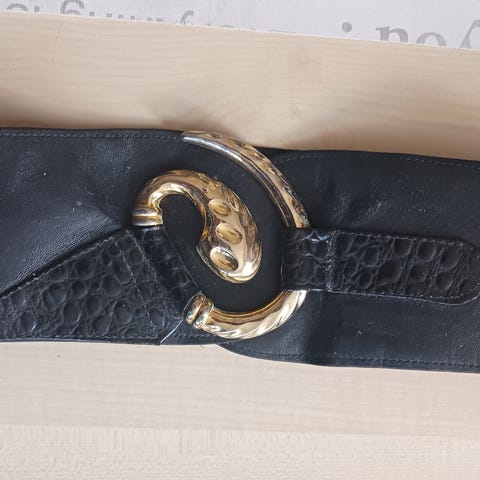 Billede 2. Elastik bælte, brunt med stort metalspænde, længde 96 cm, bredde 6,5 cm. 25,-