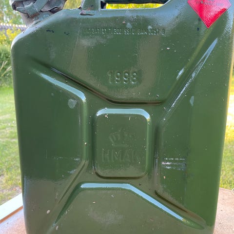 Jerrycan, Militær, Jerrycan i ok og brugbar stand. Stemplet RTB 1968. Købt i England. Kan afhentes i Kokkedal for kr. 150,-. Jeg sender ikke