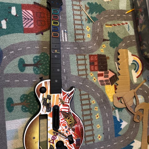 Guitar Hero Air Guitar Rocker-sæt. Har kun været ude af kassen én gang for ar blive checket, samt at kassen har få skrammer, men er udover det I meget pæn stand.