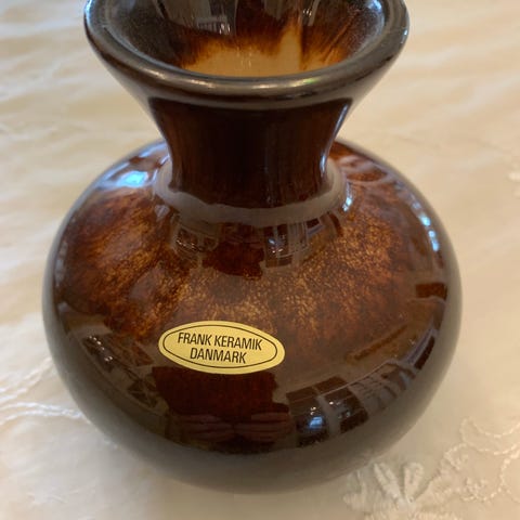 "FRANK KERAMIK havde sin storhedstid i 1960'erne og 1970'erne, og nogle vil endda mene, at det havde samme status som Kählers Omaggio har i dag; på den ene side unika, på den anden side noget, man kan købe i næsten enhver brugskunstforretning. Under alle omstændigheder er der tale om god kvalitet og lækkert design, der er karakteristisk ved det fine spil mellem den rå keramik og den glaserede."