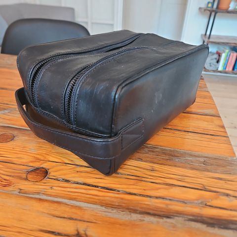 Toilettaske, Etienne Aigner, Fin sort læder toilettaske med blankt foer og to indvendige sidelommer, ca. mål: 22 x 14 x 9 cm.