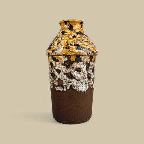 Ca. 26 cm høj. Blank/brun-lilla glasur med mønstre langs siden i blålige/orange/hvidlige farver. Mærket under bund med nummer, "5" og "Germany". Fin stand.