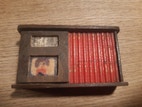 5,5 cm høj, 9,9 cm lang. Gammel/hjemmelavet mørkebrun træreol med røde bogrygge th og radio+fjernsyn tv. Umærket. Nogenlunde stand, dog lidt slid og små skader på radio/tv-forside.