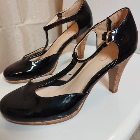Pumps, str. 39, Sort, Lak, God men brugt, Flotte pumps/stiletter med lak flet og åben tå, kan bruges af størrelse 39-(39,5) brugsspor kan forekomme.