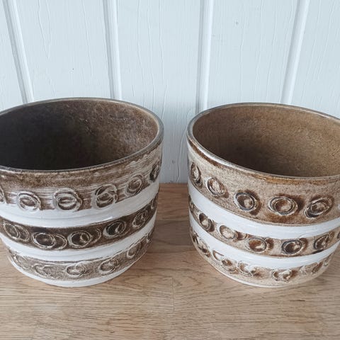 Rund ved bund, afrundet firkantet i top. Løbeglasurer i mørk/orange og ret tung keramik. Originalt mærke på siden med "Made in Italy exclusively for Stig Mörse Sweden" (Grossist-firma 1952-2010), ellers umærket.