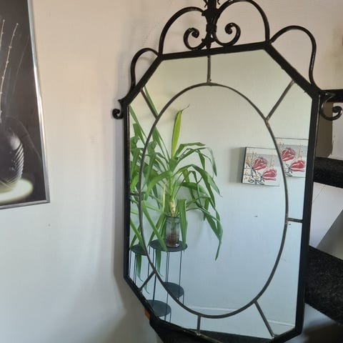 Vægspejl, b: 32 h: 47, Ovalt spejl, støbejernsramme fra tagvindue, 47 cm langt med "ben", ca. 32 cm bredt.