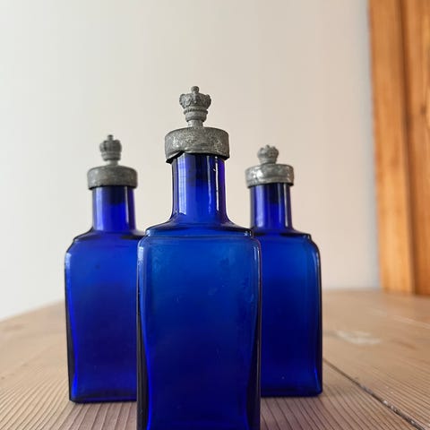 3 gamle apotekerflasker i dybe, grønne farver.