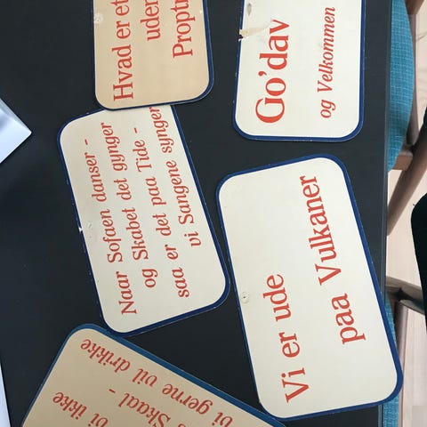 Skilte, Paphjerter med ordsprog. Skudt ned i Tivoli først i 1970’erne. H: 13,5 cm. B: 14,5 cm. Har været hængt op med knappenål i top og spids og en enkelt har en revne. Ses dog ikke så meget.