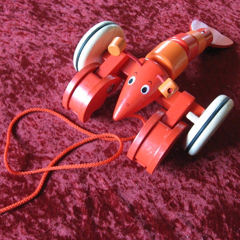 Sjældent legetøj i form af gul abe på snor.