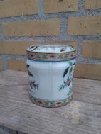 Dåser, Lille dåse, lysegrå/flerfarvede motiver, metal, 9,5 cm høj, 9 cm i diameter.