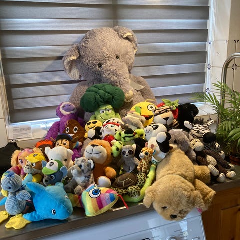 NÆSTEN SOM NYE blandede bamser, 28 bamser og fingerdukker, kylling, papegøje, giraf, tiger, frø, kanin mm.