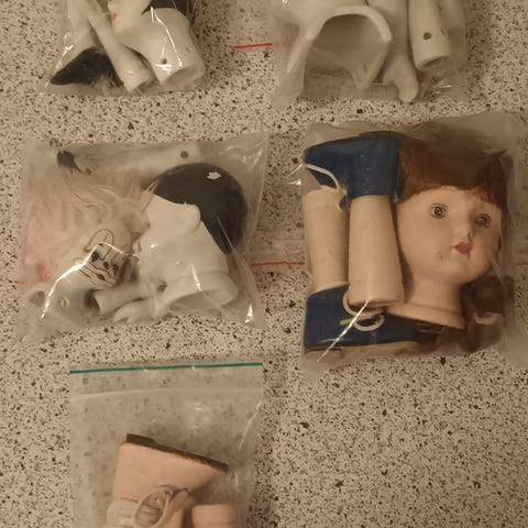 Byggesæt Dukkedele, Hovedløs... Her er et stort udvalg af porcelænshoveder, arme, ben og kroppe.. Laver du dukker eller er kunstner, er her masser at arbejde med.. Har diverse andre dele til at lave dukker "hele"..