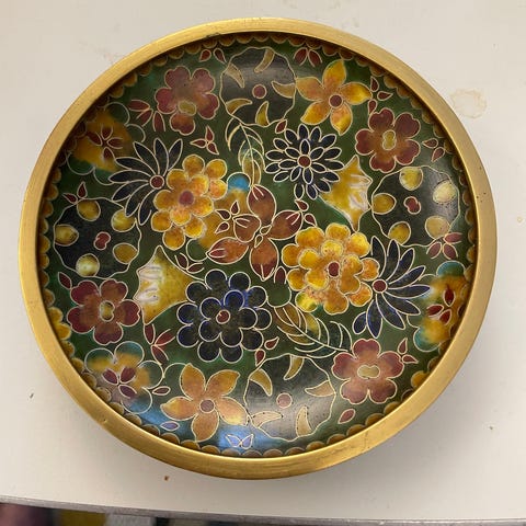 Bakke i plast med blomstermotiv, Retrobakke i plast, sort med lidt guld på kanten.