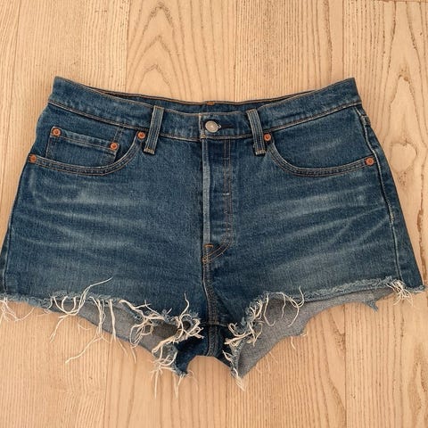 Shorts, Levi’s, str. 29, Lyseblå, Denim, God men brugt, Lyseblå, korte Levi’s shorts med knapper for til. Slid/brug kan ses på billederne.