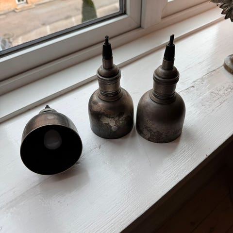 Lampe, Super cool lamper i metal - er originale gamle lamper og dermed smukt patineret.