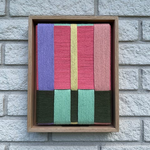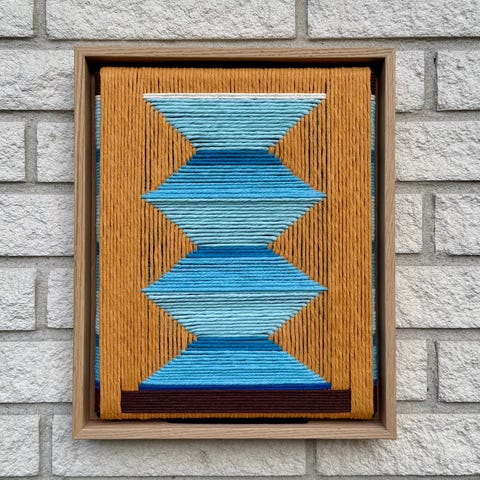 Flettet og vævet originalværk, Markvaerket, motiv: “W1B”, b: 22 h: 28, Nyt kunstværk af flettet og vævet macramé garn på lærred og sat i svæveramme af massivt egetræ.