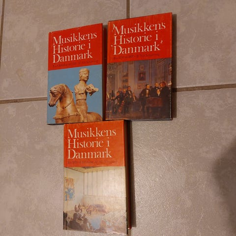Musikkens Historie i Danmark., Schiørring, Nils, emne: musik, Politikens Forlag, 1977-78. 346+360+462 sider. Helfableabind med smudsomslag Velholdt sæt. Smudsomslag med let bleget ryg. Illustreret med fotos.. Dansk