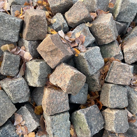 Chaussesten, 250 stk ukurante granit chaussesten. Flotte til mosaik sti eller lille mosaik terasse eller bålsted. Pris pr stk 2 kr