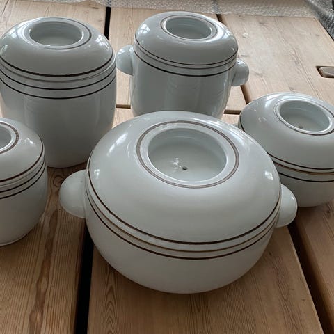 Keramiske toppe og teak kroppe. De er umærket men det er design af David Yorath og produceret af Denby i England i 60-70. (tak til Rasmus K for info)