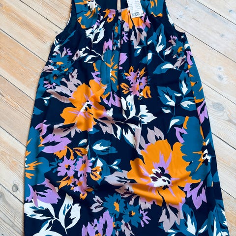 Anden kjole, H&M, str. M, Navy/hvid blomstret, Polyester, Næsten som ny, Blå/hvid blomstret kjole med bindebånd i taljen. Str. 38. Brugt 1 gang.