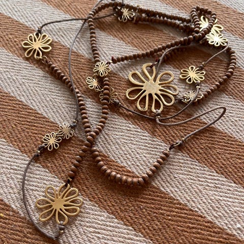 Denne kæde består af en sort lædersnor, hvor der er påsat perler i brune nuancer. Der er et vedhæng (ca. 8.5 cm. højt.) påsat. Dette er så'n ruder formet. Der er et mønster på dette vedhæng. Tror det er noget sten af en slags.
