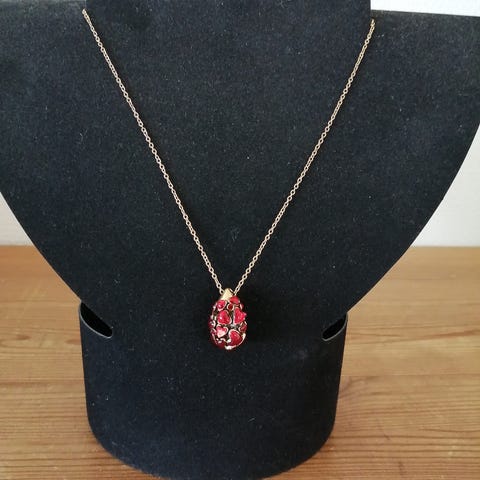 På kæden er der påsat smukke røde plast perler og i midten er der to røde fjer.