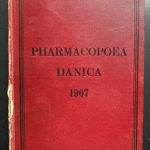 Pharmacopoea danica 1907, Udgivet sf allerhøjeste bemyndigelse, emne: historie og samfund, Meget velholdt med læderryg og intakt