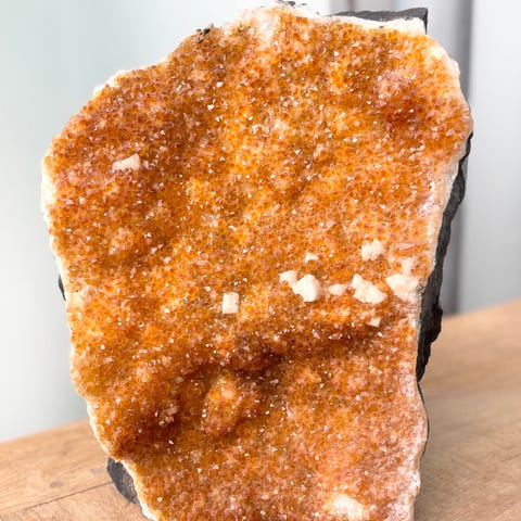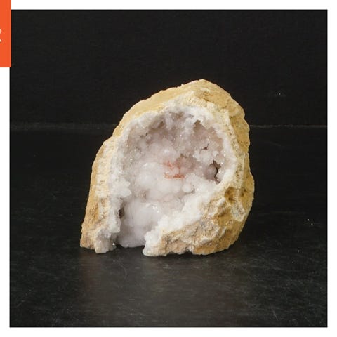 Fantastisk smuk ametyst klynge usædvanligt med smukke bjergkrystaller i. Det er sjældent at se ametyst geoder med så fine koncentrationer af bjergkrystal voksende inden i geoden. Både ametyster og bjergkrystaller er meget smukke og blandt de mest kendte krystaller i verden, her får du en fantastisk gennemskåret geode som naturen har skabt den. Geoden er dog, som de næsten altid er, forstærket med en smule cement for at sikre at den ikke knækker eller går i stykker. Den er bemalet i en mat sort-grøn så den ligner den naturlige geode på overfladen. Denne er fra Brasilien.