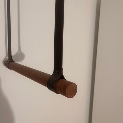 Bøjlestang, Stolbjerg Copenhagen, Bøjlestang lofthængt, mrk. Stolbjerg Copenhagen, fed knage til bøjler med træstang og tykke læderremme, bøjlestang L.117, læderremme kan forlænges og forkortes med lille skrue bagved, monteres i loftet, perfekt stand