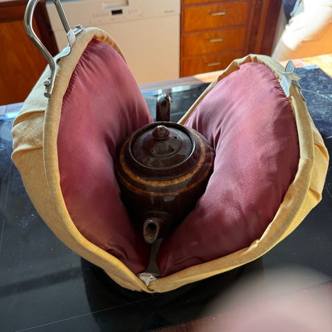 Thehætte og hætte til stempelkande. Fin og rummelig thehætte, 84 cm i omkreds og 20 cm høj, hætten til stempelkanden er 32 cm høj. Begge hætter er NYE og ubrugte. Pris: Thehætten 95,- kr. og stempelkande hætten 75,- kr. - Begge dele 160,-