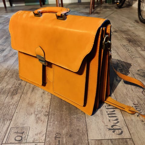 Ubrugt lædermappe med to indvendige rum og et mindre med lynlås på bagsiden. Sort. Mål: 40x30x7cm.. Kan sendes for købers regning eller hentes i Odense.