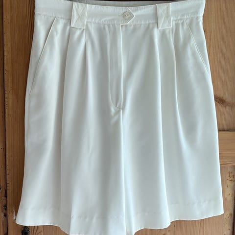 Shorts, Stina, str. M- 40/42, Råhvid/natur, 100% Råsilke, Ubrugt, Superfine Shorts/ kort nederdel. Mrk: Stina. str. M - 40/42. 100% Råsilke. Farve. Råhvid/natur. Har elastik i taljen bag, Fast stykke fortil og 2 lommer. Vidden i benene gør at de er som en smart kort nederdel. Fra 80erne, men aldrig brugt. Skridt l. 18,5 cm. Længde fra talje til benkant: 49 cm. Pris. 35,- kr. + porto. Sender gerne.