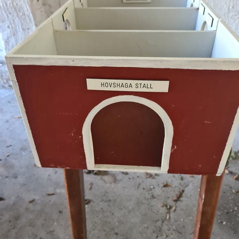 Stald, lille stald i bondehus stil med mand, traktor. mad, grise høhæk og hegn nogle dele er fra Playmobil