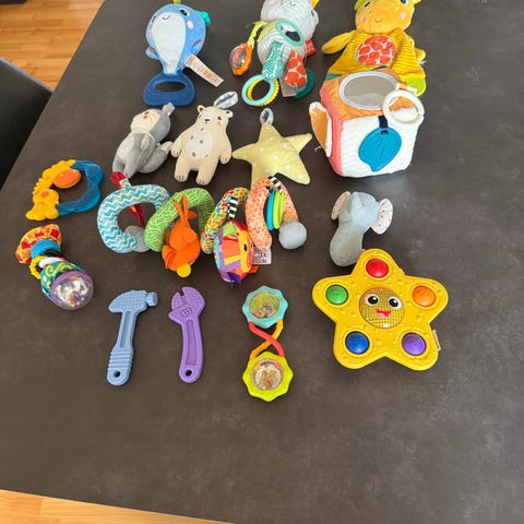aktivitetslegetøj, Diverse babylegetøj, stofbøger, uro til puslebord med aftagelige dyr, musikinstrumenter til batteri.